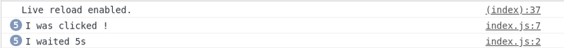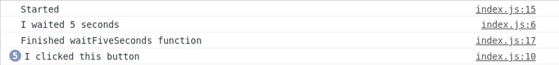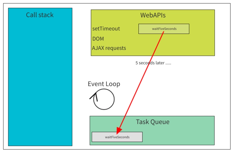 由于 waitFiveSeconds 函数被暂时从堆栈中释放,控制台中出现了“I was clicked!”。5 秒后,waitFiveSeconds 函数将从 Web API 推送到任务队列。