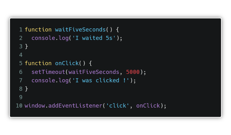 这是因为 waitZeroSeconds 函数被推迟了,只有当堆栈为空时才会执行。考虑到点击后,堆栈不可能为空,因为 onClick 函数的执行上下文位于其顶部。只有当所有已初始化的内容都从堆栈中弹出后(在我们的例子中是 console.log('I was clicked')),waitZeroSeconds 函数才会执行。
