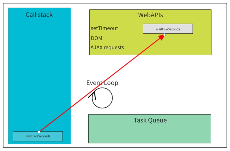 正如我上面提到的,浏览器中可能发生很多事情,其中一些是事件循环、任务队列和 Web API。后者,例如 Ajax 请求、setTimeout 或 DOM(文档本身)与堆栈和任务队列通信。让我们以最后一段代码为例。有些人可能会感到惊讶,代码似乎无需等待 waitFiveSeconds 函数就可以运行。这是因为 setTimeout 使用了计时器 API。整个操作从堆栈中移出的时间相当于我们作为第二个参数给出的毫秒数。此外,setTimeout 回调是异步的。当然,并非 JavaScript 中的所有回调都是这样运行的。更重要的是,它们中的大多数是同步的。例如,我们传递给数组方法(如 map() 或 filter())的回调。但是,有些回调是异步的。示例中最简单且最常用的是 setTimeout。它让我们模拟从服务器获取数据。