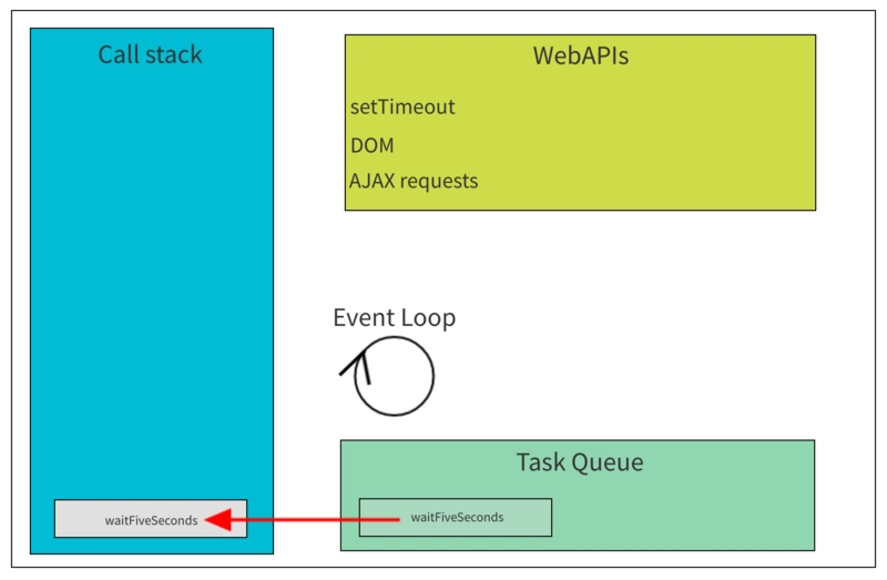 任务队列只不过是一个推送任务的队列。没有什么可以阻止您将多个任务排队。当然,我们不希望异步函数被遗忘,因此我们必须以某种方式将它们重定向回堆栈。幸运的是,我们不必亲自解决这个问题——如果我们的堆栈为空(意味着没有要执行的操作,没有创建执行上下文),并且我们的任务队列不为空,则第一个任务将被推送出任务队列。由于函数 waitFiveSeconds 被暂时从堆栈中释放,控制台中出现了“我被点击了!”。5 秒后,函数 waitFiveSeconds 将从 Web API 推送到任务队列。