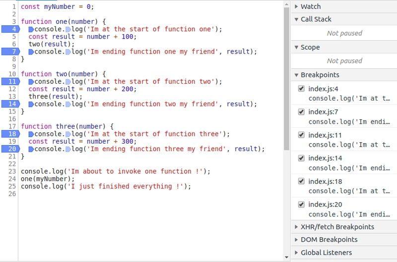 为什么要有这么多控制台日志?嗯,我认为没有什么比记录当前发生的事情更好的了。当我们运行脚本时,所有变量和函数语句都会存储在内存中(女士们先生们,提升),然后代码就会开始执行(执行阶段)。我会使用 Chrome 开发工具并设置几个断点,这样我们就可以随时暂停脚本的执行。