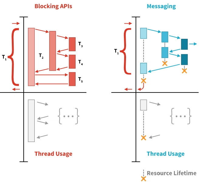 同步阻塞通信(左)资源效率低下,容易出现瓶颈。反应式方法(右)降低了风险,节省了宝贵的资源,并且对硬件/基础设施的需求更少。