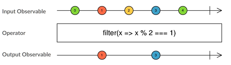 中间的代码块是我们的运算符函数,它接受一个可观察变量并返回另一个。因此,我们的函数通过对输入的可观察变量取模 2 来过滤输入的可观察变量,判断被推送的值是否为偶数,如果是,则允许该值通过,本质上就是对流进行过滤。