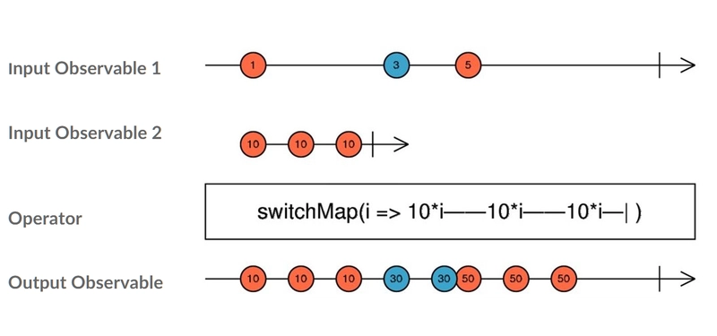 如前所述,运算符可以有多个可观察对象作为输入,例如以下运算符的情况switchMap