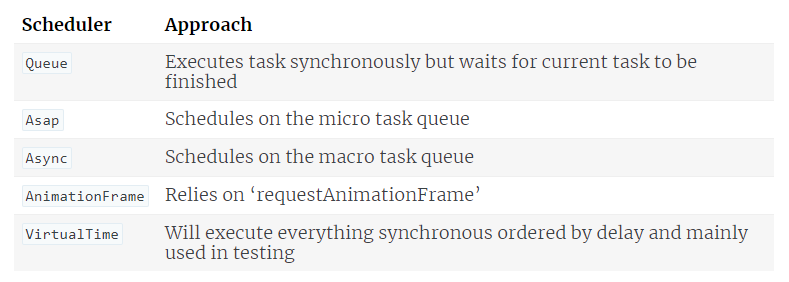 最后,调度器!它们可能看起来很难理解,但从表面上看相当简单,我们了解一下就足够了。本质上,调度器控制着可观察对象的任务顺序。调度器只有几个,而且短期内不会改变,具体如下: