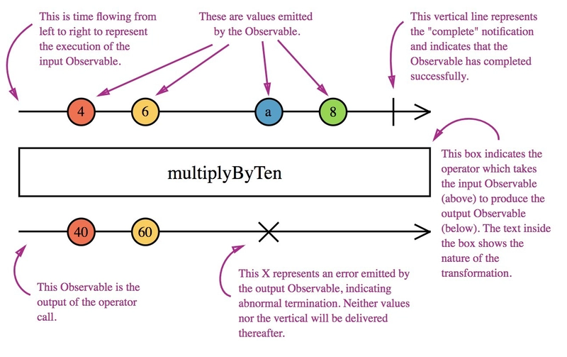 学习响应式编程可能是一项艰巨的任务,因此 Rx 团队提出了弹珠图的概念,以帮助直观地理解可观察对象及其操作符。这些图非常直观,通常出现在任何 Rx 操作符文档中。它们让您无需阅读太多其他内容就能轻松理解操作符。这比厚厚的、充满术语的文字更实用!我会尽力解释如何阅读它们:
