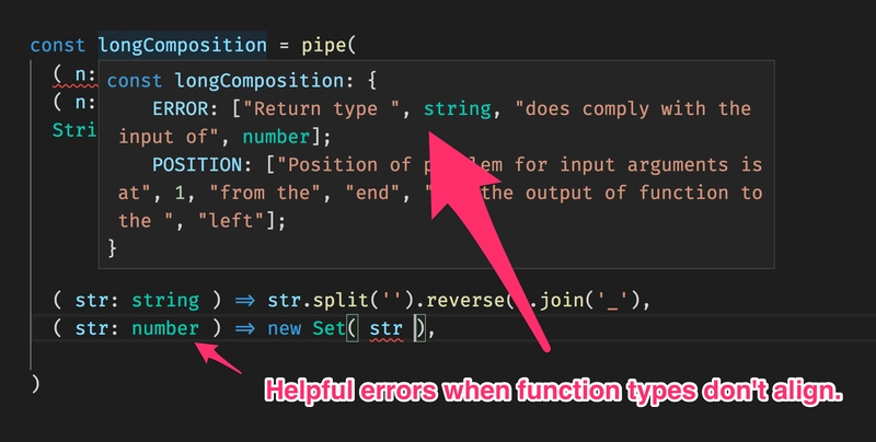 这里还有另一种技巧可以说明。当Pipe函数返回那个有用的错误对象时,我们实际上也希望引发编译器错误。我们通过将匹配的类型fns与自身或条件连接来实现这一点never。后者的条件会导致错误。